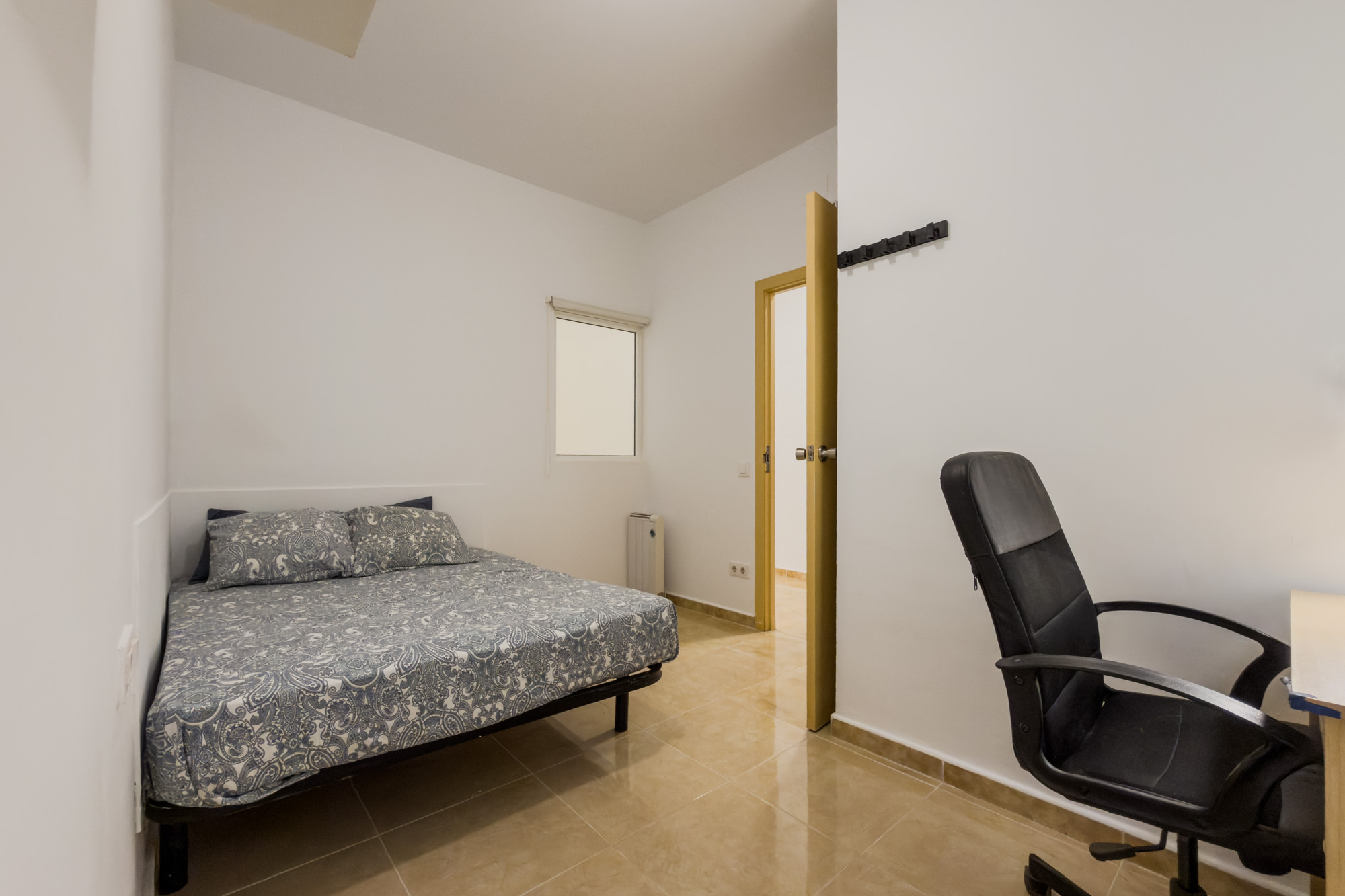 This generously sized room is fully furnished with a double bed, desk, wardrobe, and mirror, providing a comfortable, functional space to relax or focus. An interior window facing the living room brings in indirect light while maintaining privacy.